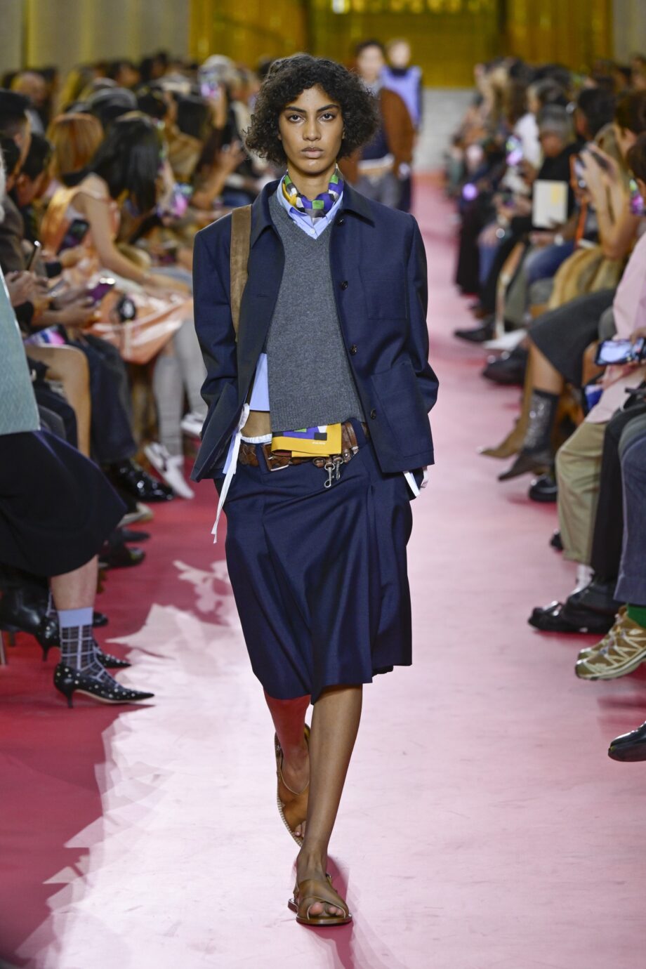 Στον οίκο Prada το κλασικό ανθρακί γκρι blazer απογειώνεται με ένα μικροσκοπικό μπλε bandeau top και μια αντίστοιχη χρωματική πινελιά στην πλισέ φούστα: ένας συνδυασμός υφών που αλλάζει όλη τη διάσταση του συνόλου. Το look ολοκληρώνεται με ένα ζευγάρι κομψά και άκρως θηλυκά slingbacks.