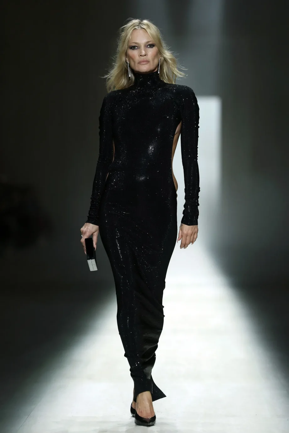 Επαναπροσδιορίζοντας την άνοιξη ως μια αναγέννηση, ο Demna εισάγει ένα νέο λεξιλόγιο Gucci. Τα στυλ που φορούσαμε τη δεκαετία του 2000 επέστρεψαν, από υφασμάτινες ή διπλές ζώνες G, μέχρι γυαλιά ηλίου μάσκα, καλσόν με λογότυπα και τσόκερ. Ακόμα και το διάσημο φόρεμα G-string από την εποχή του Tom Ford αναβιώνει στην πασαρέλα – εδώ λαμπερό, φορεμένο από την Kate Moss – όπως και τα loafers με τη γούνα που έφερε στο προσκήνιο ο Alessandro Michele.