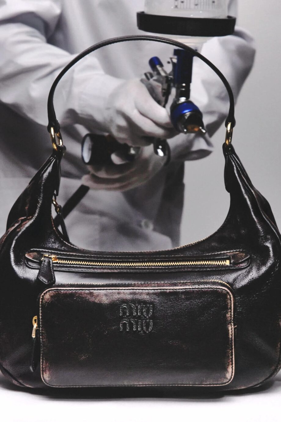 Η διαδικασία ξεκινά με τα πιο εκλεκτά δέρματα, τα οποία μελετώνται για τα μοναδικά τους χαρακτηριστικά, ώστε να διασφαλιστεί ότι διατηρείται η φυσική τους ομορφιά και τα σημάδια του χρόνου. Στη συνέχεια, το δέρμα τρίβεται, πλένεται και βουρτσίζεται στο χέρι, ώστε να αποκτήσει μια φθαρμένη όψη. Το αποτέλεσμα είναι το γνωστό σε όλους used leather effect του Miu Miu, που κάνει ένα βήμα μπροστά, επιλέγοντας να γιορτάσει τον χρόνο και την ανθεκτικότητα της μοντέρνας γκαρνταρόμπας.