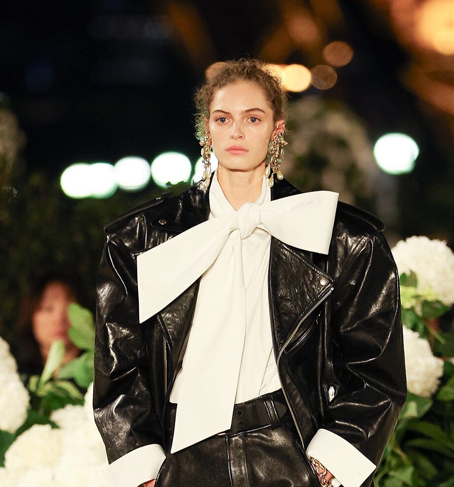 Go big or go home ήταν το μήνυμα του Saint Laurent για την Άνοιξη/Καλοκαίρι 2026, με τα σύγχρονα Working Girls να φορούν biker jackets με έντονους ώμους και δερμάτινα φούστες με pussy bows.