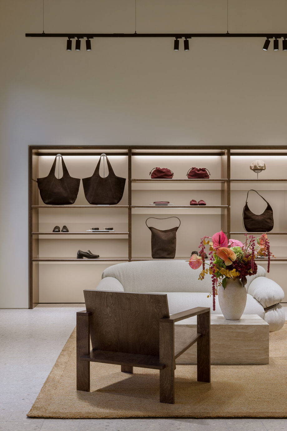 Συνεχίζοντας την εξερεύνηση στην μπουτίκ, τα επιλεγμένα έπιπλα αντικατοπτρίζουν τον σεβασμό της μάρκας προς τη διαχρονική δεξιοτεχνία. Τα ρούχα και τα αξεσουάρ από τις womenswear και menswear συλλογές, βρίσκονται σε αλουμινένιες ράγες και βιτρίνες με ράφια από ανακυκλωμένα υλικά. Τα made in Italy τραπέζια από σύνθετο υλικό που περιλαμβάνει ανακυκλωμένες ίνες κυτταρίνης και φυσικές χρωστικές από τη γη – προσθέτουν ζεστασιά, υλικότητα και μια χειροποίητη αίσθηση στον χώρο.